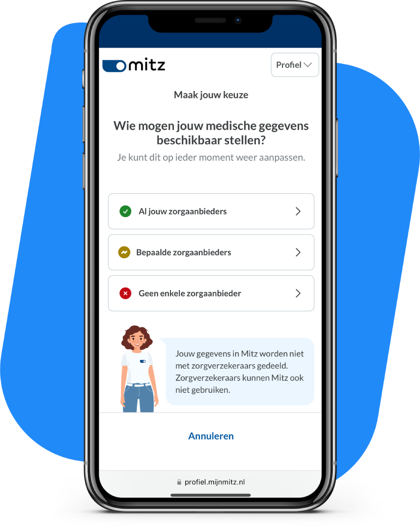Zorgaanbieders hebben soms uw medische gegevens nodig van andere zorgaanbieders. Wij kunnen u dan beter helpen. Voor het uitwisselen van uw gegevens is soms toestemming nodig. Alleen met uw toestemming mogen uw eigen zorgaanbieders medische gegevens beschikbaar stellen. Een nieuwe zorgaanbieder kan uw medische gegevens dan elektronisch opvragen als dat nodig is voor uw behandeling. Uw keuzes worden veilig opgeslagen in Mitz. Alleen uw keuzes zijn te zien in Mitz. Uw medische gegevens niet.